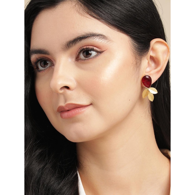 Maroon and gold-toned teardrop shaped drop earrings, gold-plated, has artificial beads Secured with a post and back MATERIAL & CAREBrassCare InstructionsWipe your jewellery with a soft cloth after every useAlways store your jewellery in a flat box to avoid