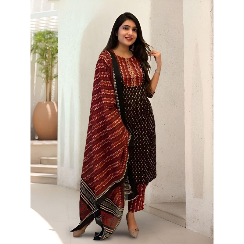 Black printed Kurta with Trousers with dupattaKurta design: Ethnic motifs printedStraight shapeRegular styleRound neck, three-quarter regular sleevesKnee length with straight hemCotton blend knitted fabricTrousers design: Printed TrousersElasticated waistb
