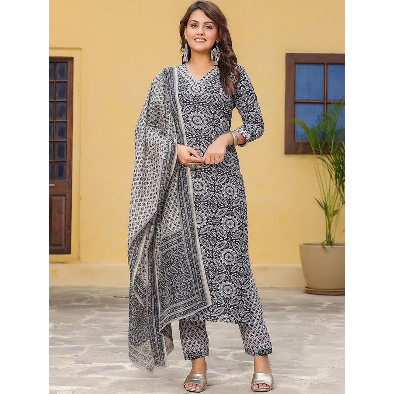 Black printed Kurta with Trousers with dupatta Kurta design: Ethnic motifs printed Straight shape Regular style V-neck, three-quarter regular sleeves Na pockets Calf length length with straight hem Cotton blend knitted fabric Trousers design: Self design T