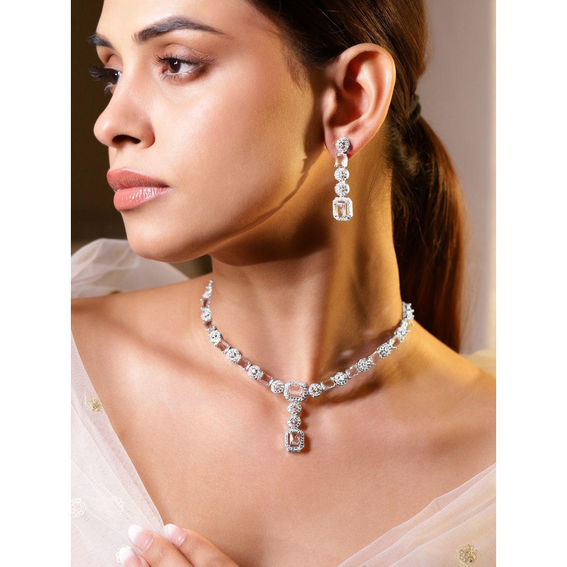 This jewellery set consists of a necklace and a pair of earringsRhodium-plated necklace, has white Cubic Zirconia stone-studded detailsSecured with a Hook closureA pair of matching drop earrings, each secured with a post-and-back closureMATERIAL & CAREMate